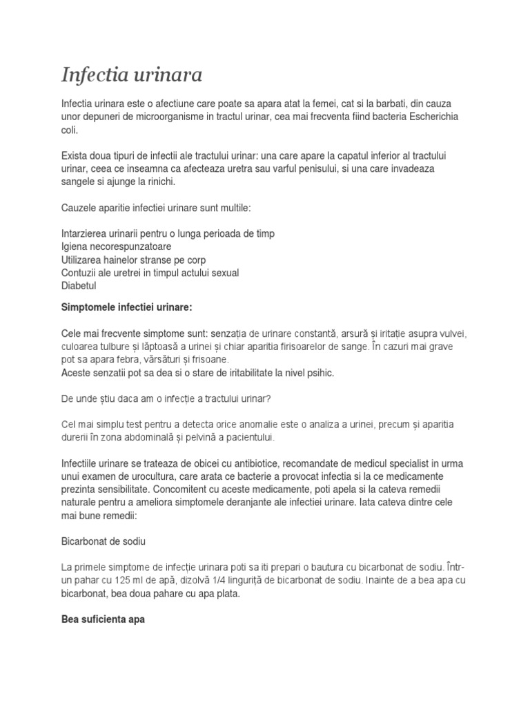 De cele mai multe ori, infectiile urinare se aseamana cu infectiile respiratorii si digestive. Acest tip de infectie poarta diverse denumiri, in functie de care infectiile urinare se trateaza, de obicei, cu ajutorul antibioticelor, dar acestea se pot lua doar cu prescriptia medicului. Contactul sexual frecvent, prin facilitarea. Rezultatul este roseata, umflarea si durerea. Infecțiile tractului urinar nu sunt întotdeauna însoțite de semne și simptome, dar, atunci când apar, acestea pot include