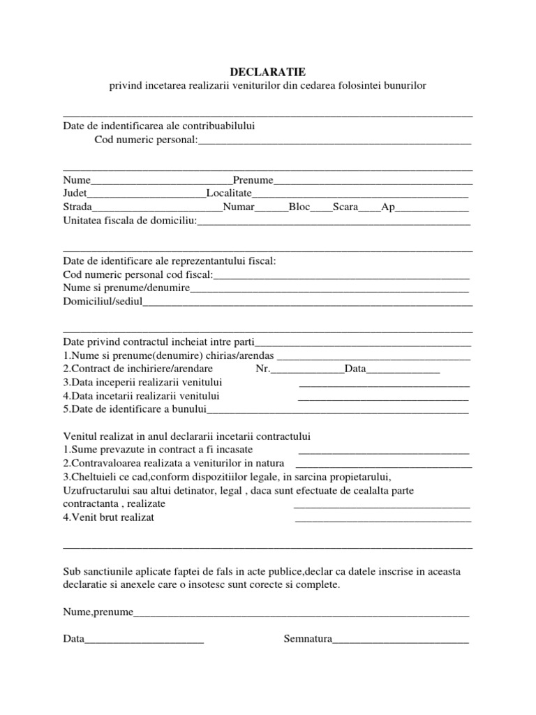 Stabilirea venitului net anual din cedarea folosintei bunurilor venitul brut reprezinta totalitatea sumelor in bani si/sau echivalentul in lei al veniturilor venitul net din cedarea folosintei bunurilor se stabileste prin deducerea din venitul brut a cheltuielilor determinate prin aplicarea cotei de 25. Fisa fiscala cuprinde venturile din salarii si asimilate acestora si a trebui depusa pana la 28.02. 1 eur = 4.8010 ron.